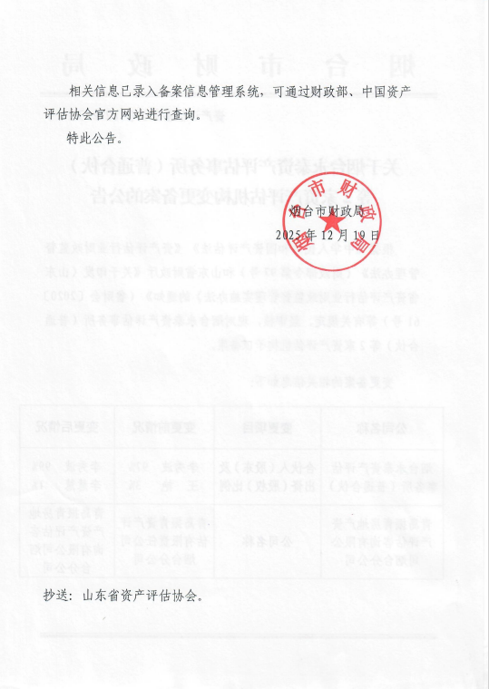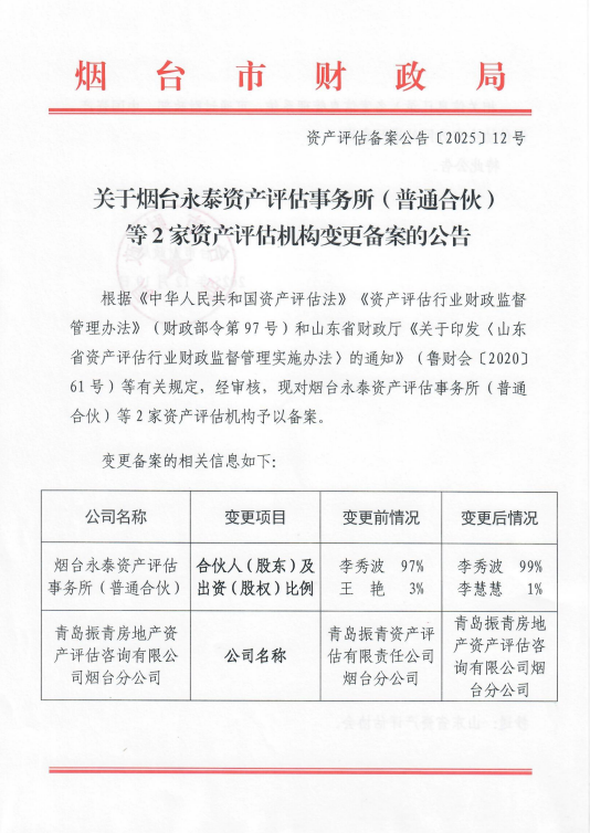 关于烟台永泰资产评估事务所(普通合伙)等2家资产评估机构变更备案的公告
